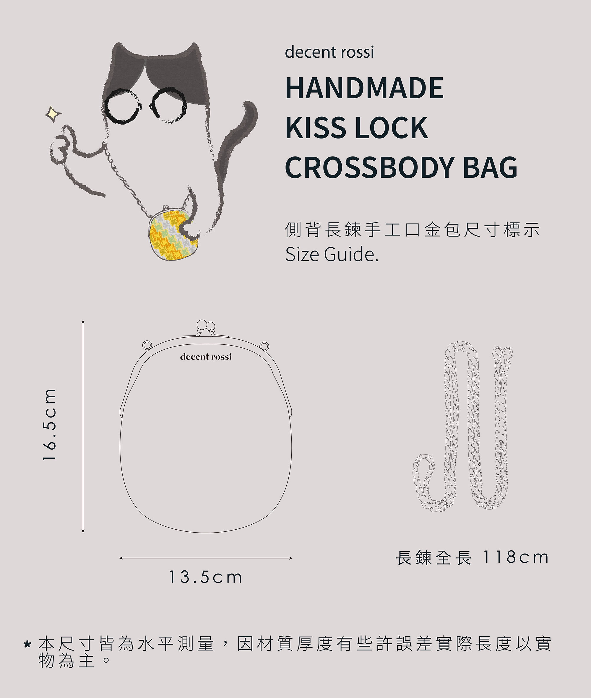 Width: 13.5 cm, Height: 16.5 cm, Total chain length: 118 cm.